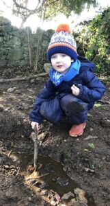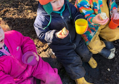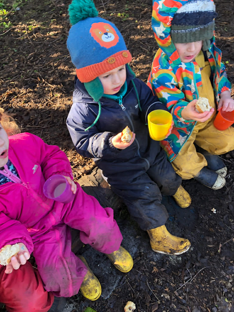 Sessions begin with a warmup of games on the grass, and then we move to the forest to talk about safety rules around the fire circle. The children then have freedom to explore the forest at their own pace, and this encourages deeper learning through digging, looking at minibeasts, climbing trees and playing in the mud kitchen. We come together mid-session to enjoy a snack, warm drink and to reflect on how the session is going to be able to extend for the next week’s session.